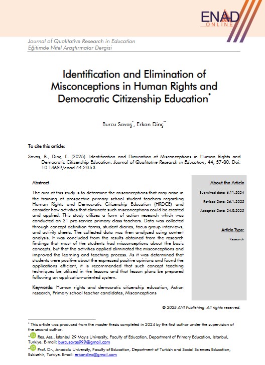 Üniversitemiz Temel Eğitim Bölümü Sınıf Eğitimi Anabilim Dalı’ndan Arş. Gör. Burcu SAVAŞ ile danışmanı Prof. Dr. Erkan DİNÇ’İN ortak yazarları arasında yer aldığı, yüksek lisans tezinden üretilen “Identification and Elimination of Misconceptions in Human Rights and Democratic Citizenship Education” başlıklı makale, uluslararası hakemli dergi olan ESCI indeksli “The Journal of Qualitative Research in Education” dergisinde yayımlanmıştır.